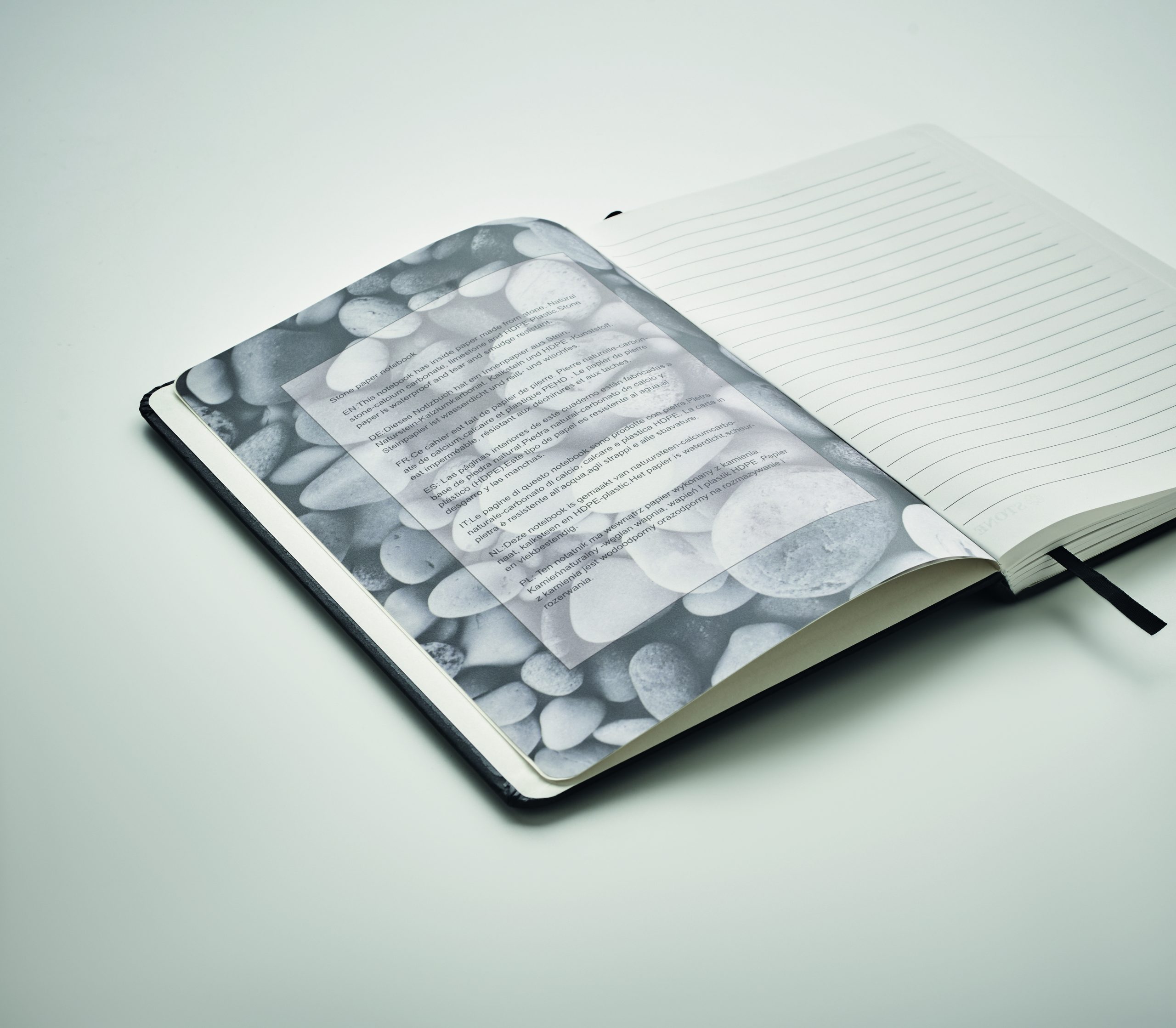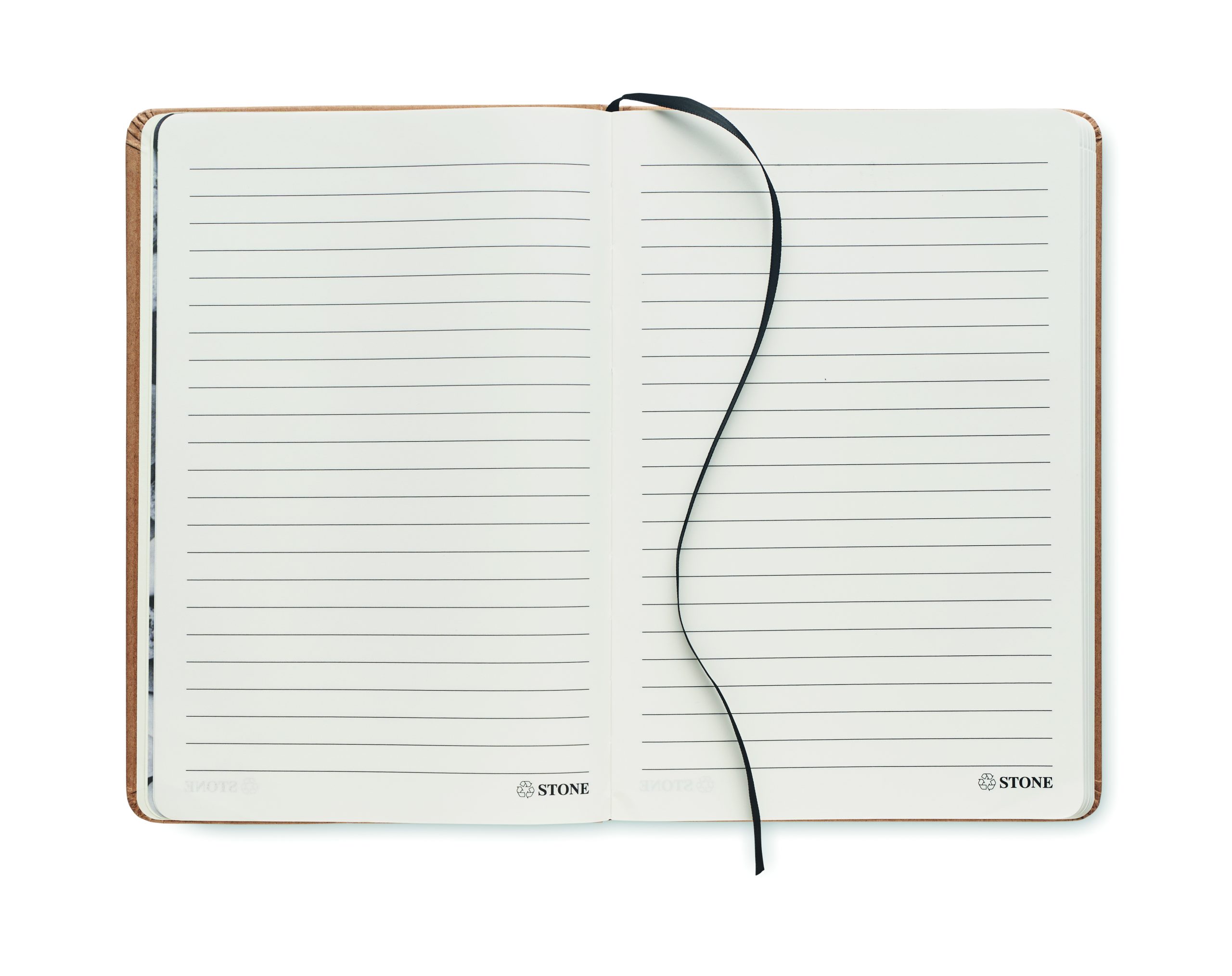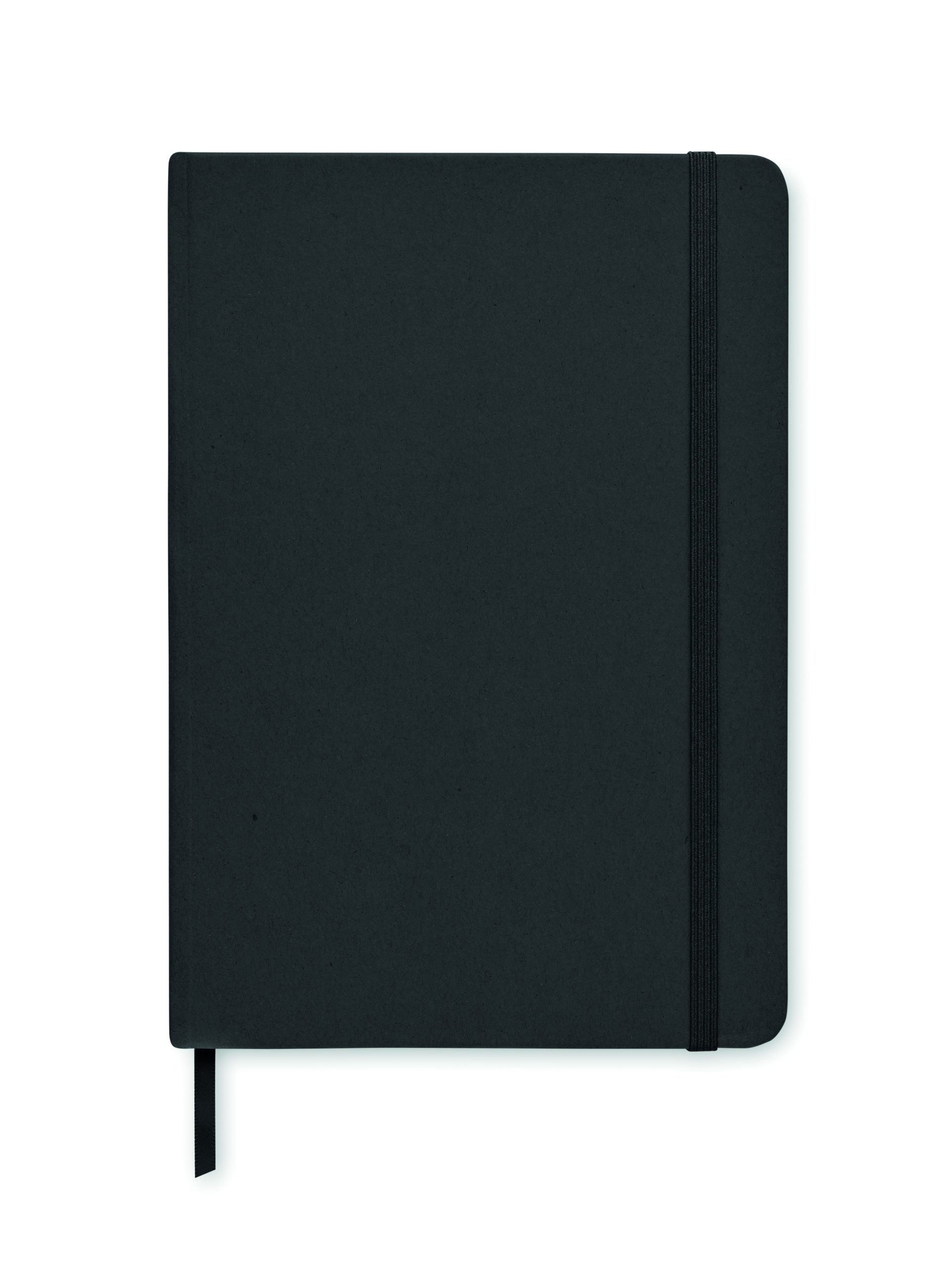 Notatnik A5 z twardą okładką z recyklingowanego kartonu. 160 z papieru w linie (80 kartek) papier mineralny. Dopasowana gumka zamykająca i tasiemka do oznaczania stron. FSC®-certified | FSC MIX CREDIT, P7.1 , FSC-C213206