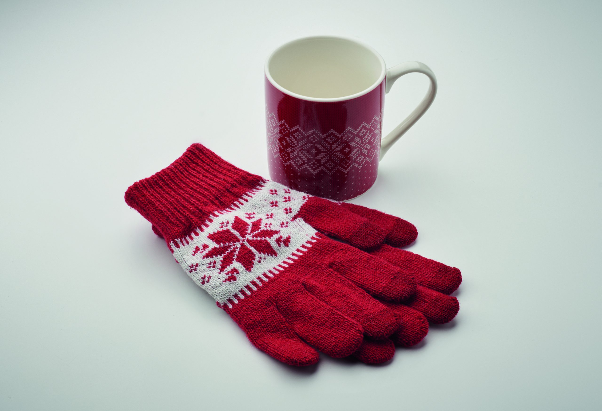 Zimowy zestaw upominkowy zawierający: rękawiczki z dzianiny z wykończeniem do ekranu dotykowego w zimowym wzorze oraz ceramiczny kubek. Pojemność: 300 ml. Całość w dopasowanym pudełku.