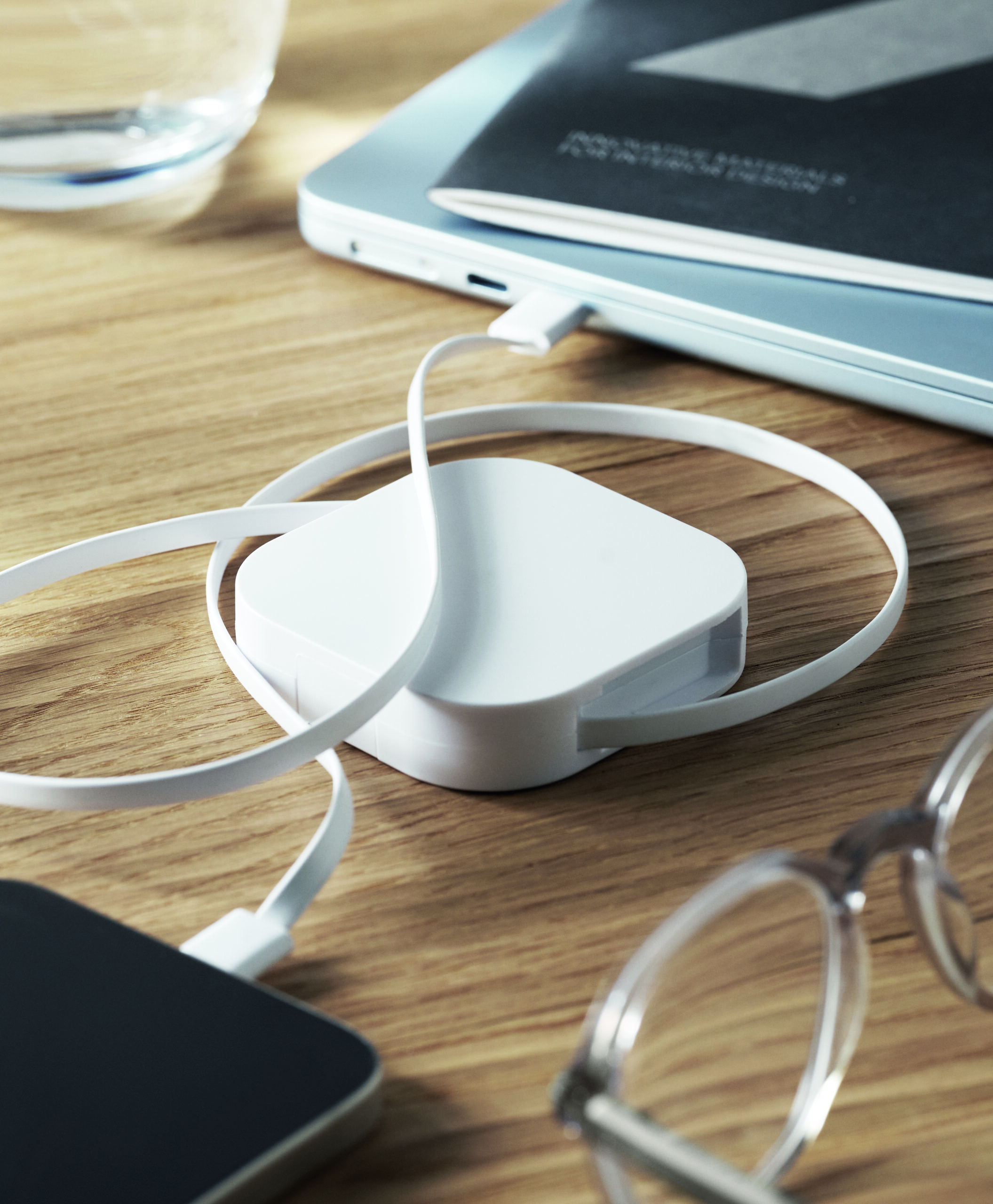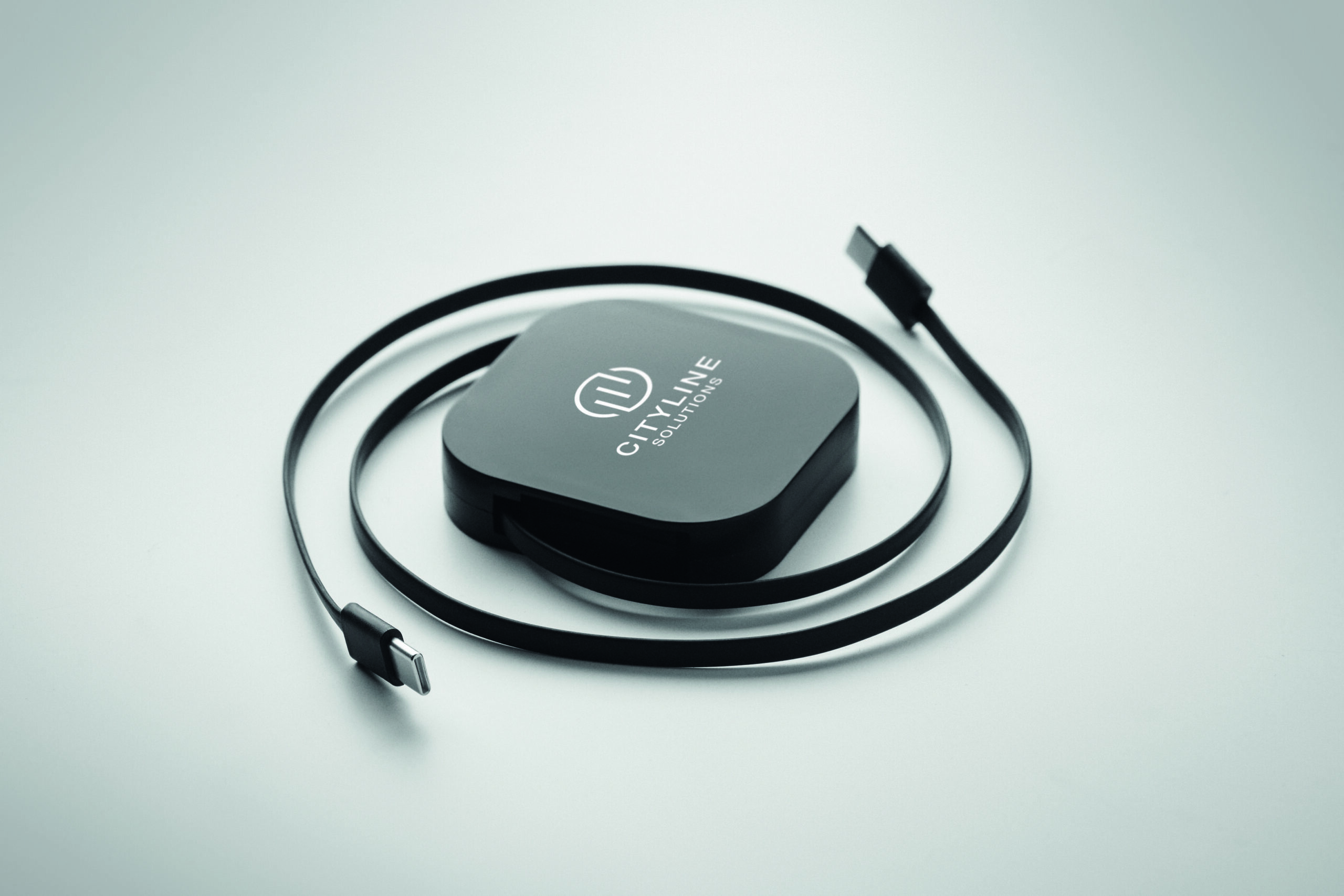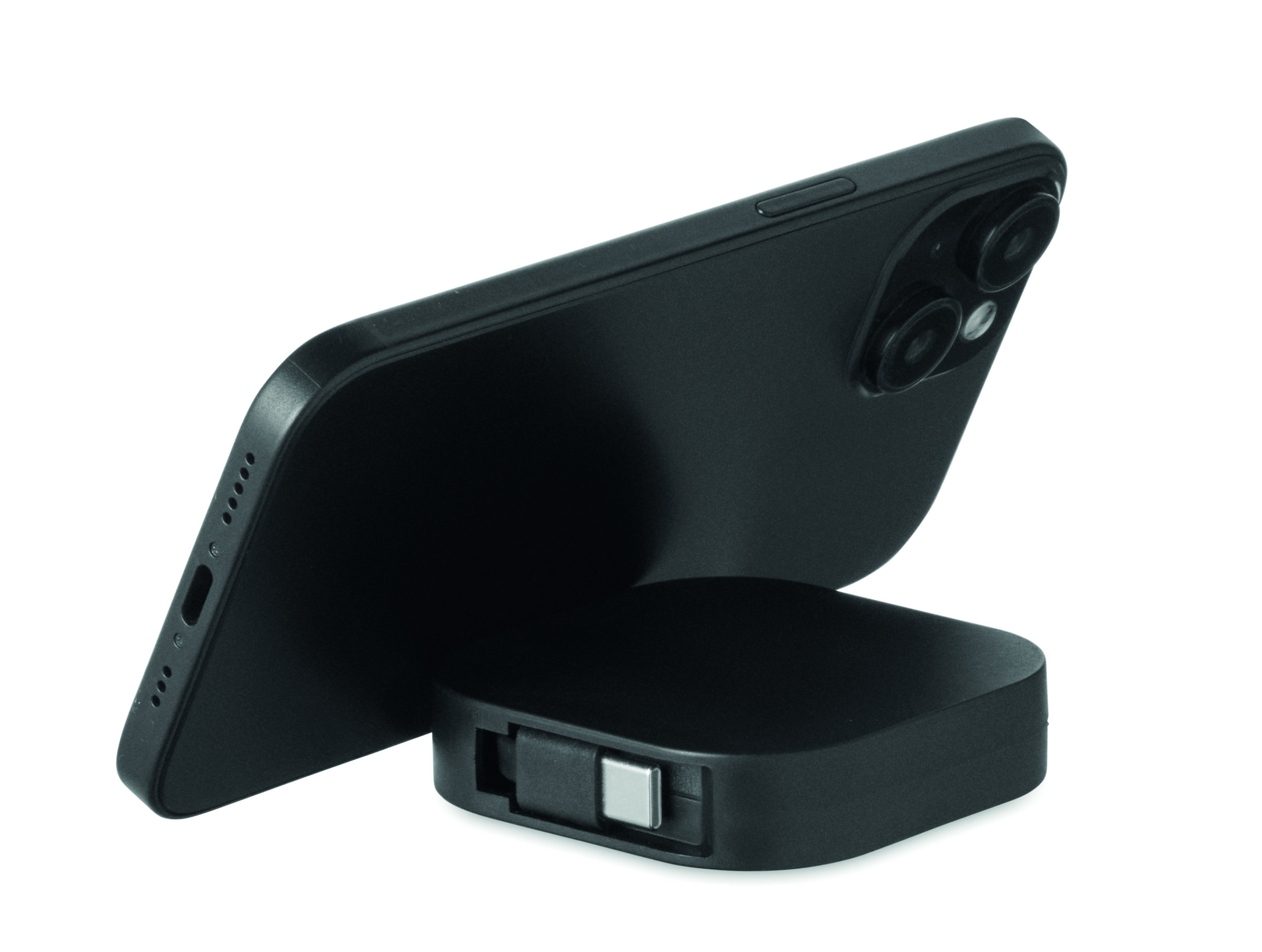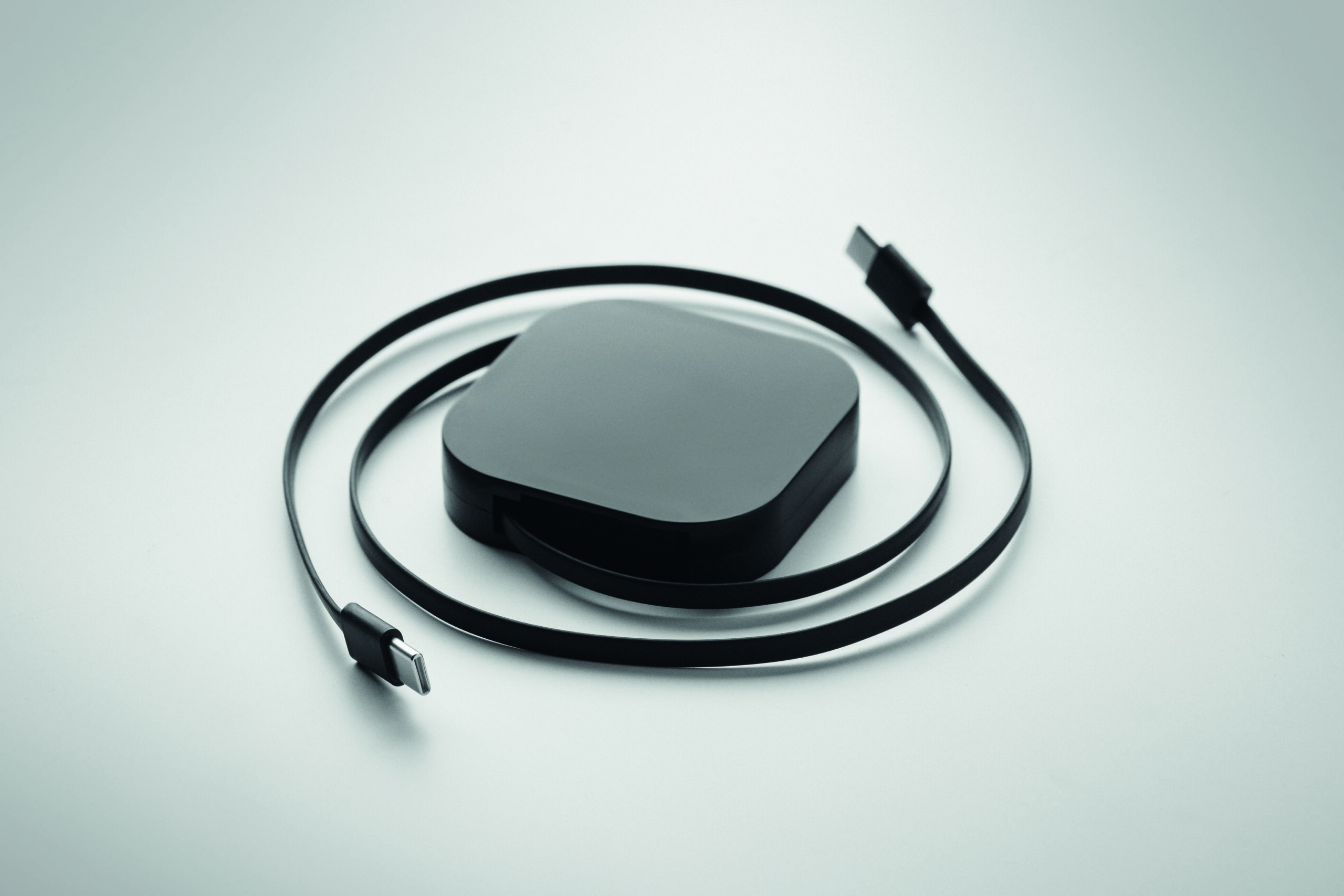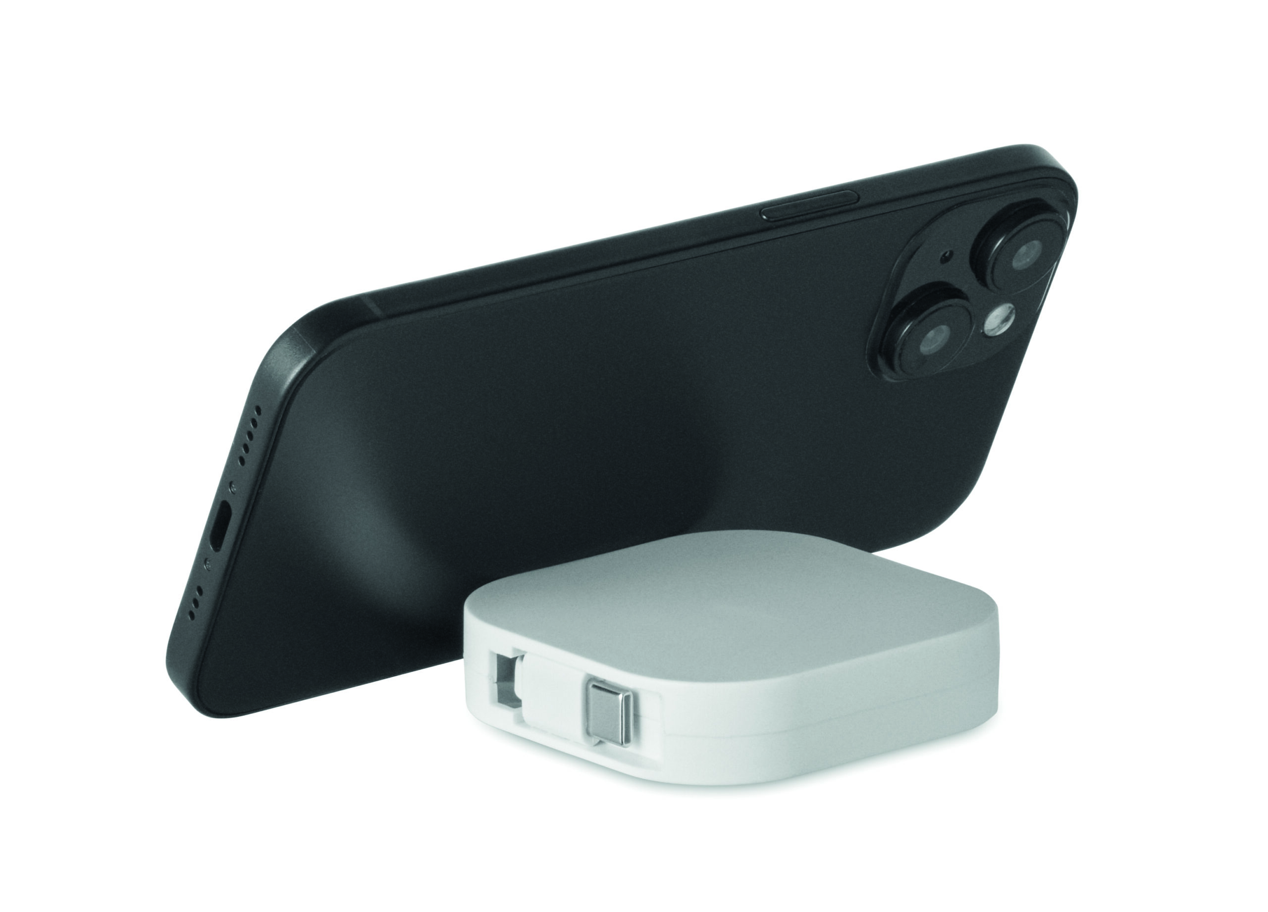 Zwijany kabel do ładowania i transmisji danych o mocy 100 W. Zawiera funkcję uchwytu na telefon. Kabel PVC z obudową ABS do zasilania i przesyłania danych (480 Mb/s). Połączenie Type-C do Type-C.