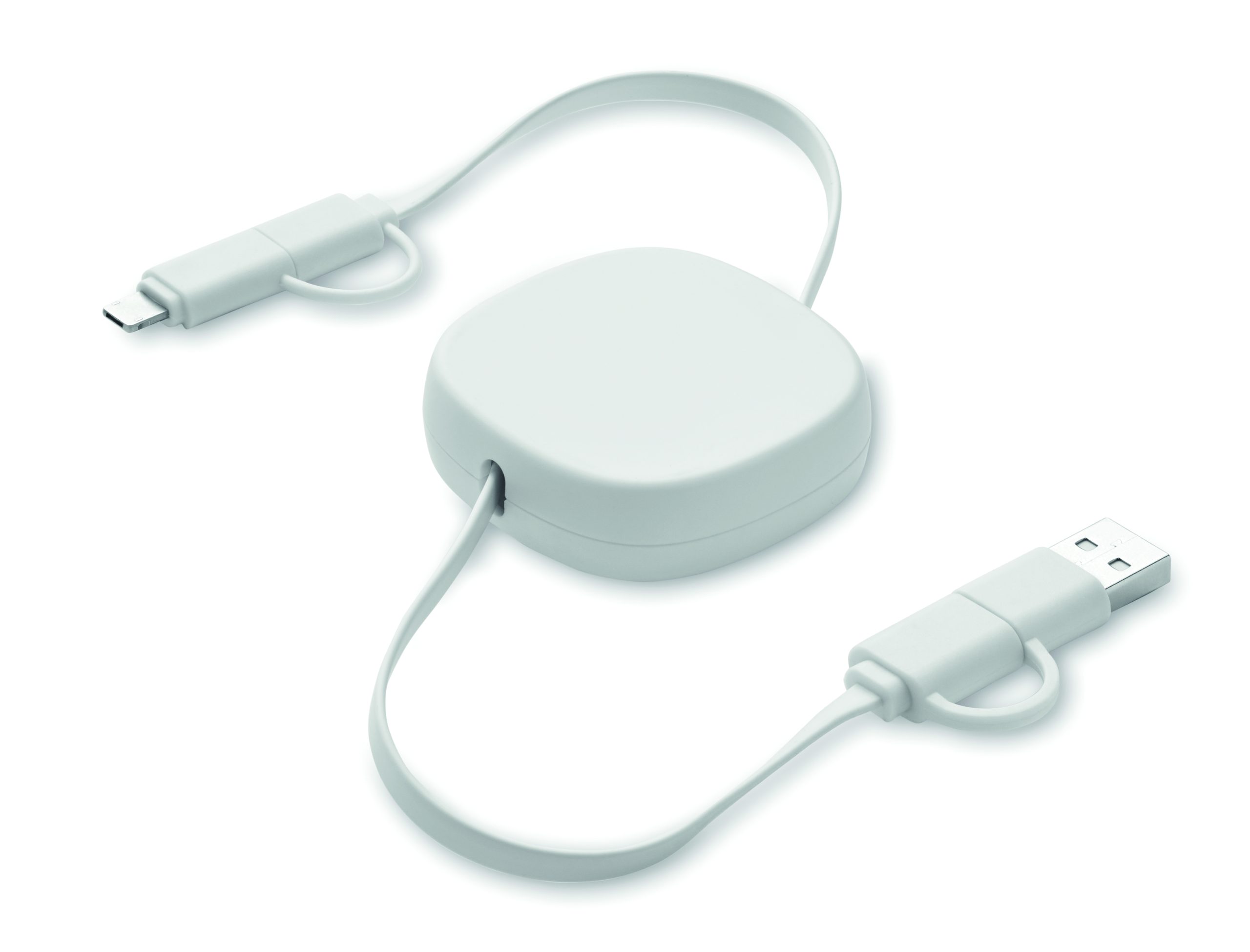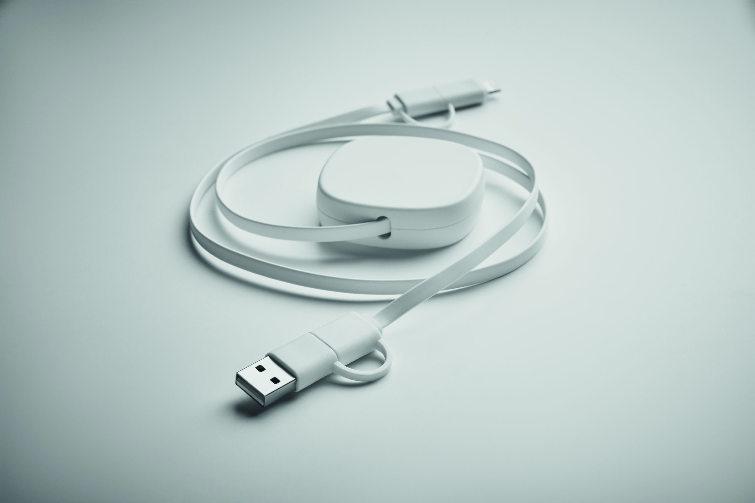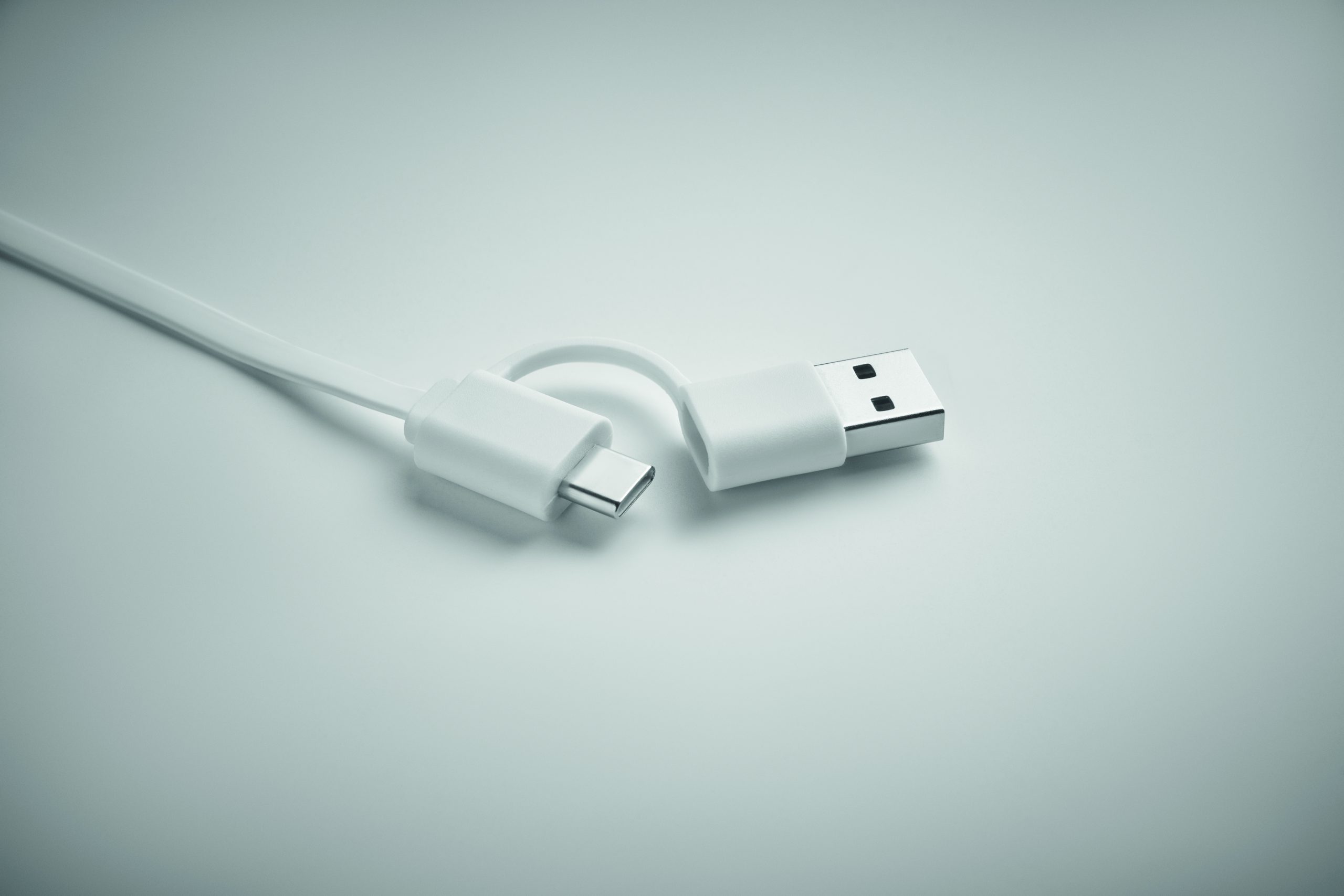 Zwijany kabel o mocy 60W w obudowie ABS z recyklingu. Wejście: 2-w-1 Typ-C i Typ-A. Wyjście: Typ-C i micro-B (2 w 1 pin). Długość kabla: 80 cm.